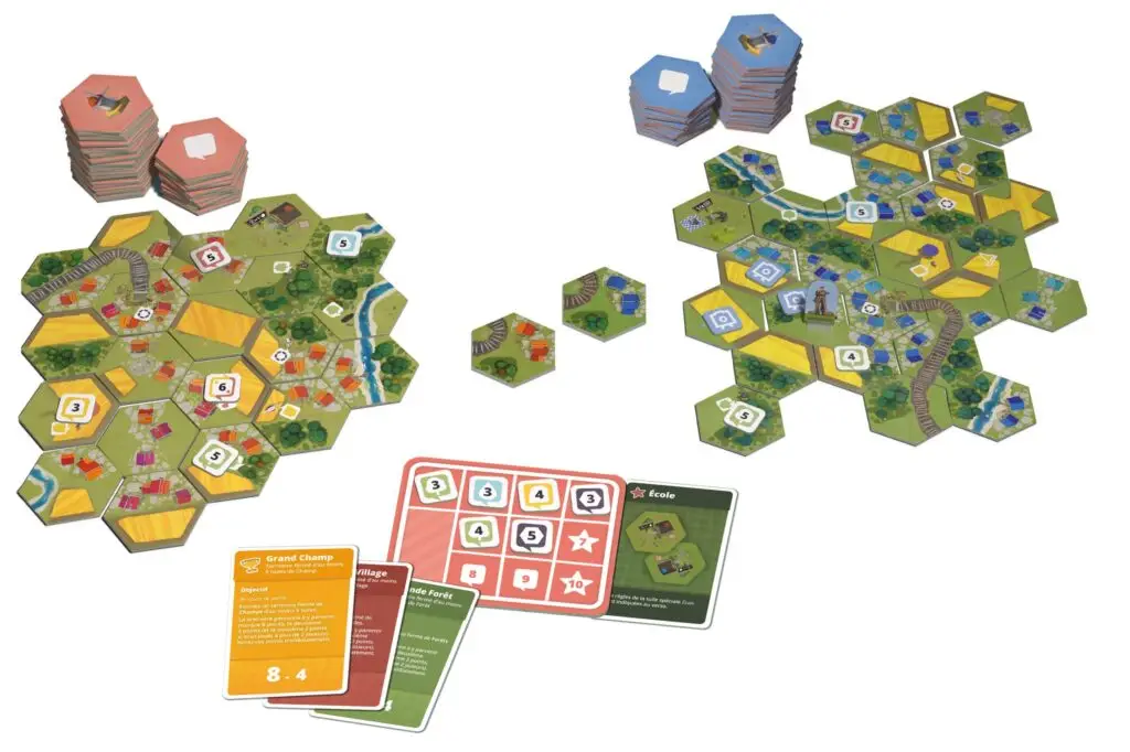 Dans Dorfromantik – Le Duel, chaque joueur construit son paysage avec des tuiles hexagonales tout en rivalisant pour répondre aux besoins des villageois. Ajoutez des tuiles spéciales et objectifs pour encore plus de défis. Un jeu stratégique idéal pour les fans de Dorfromantik