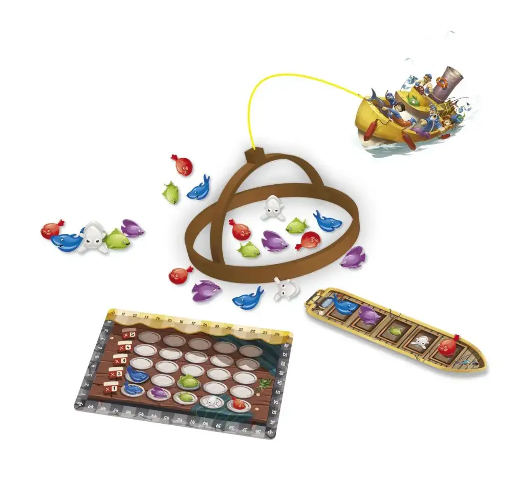 Dans Jour de Pêche, utilisez différents filets pour capturer des poissons et les vendre au marché. Un jeu d’adresse malin pour 2 à 4 joueurs, à partir de 6 ans, avec un matériel ludique et un thème immersif.