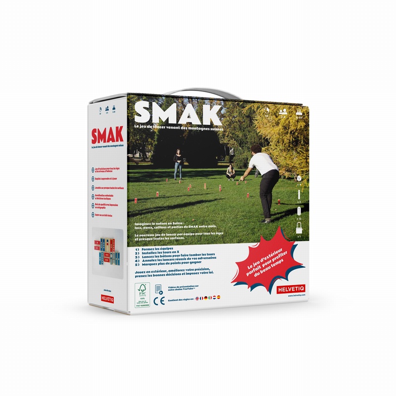 Smak est un jeu d’adresse extérieur captivant qui demande à la fois de la rapidité et de la stratégie. Chaque lancer compte pour faire tomber les tours et déjouer les plans de vos adversaires. Avec des parties dynamiques et des défis tactiques, ce jeu promet des moments de compétition et de fun en famille ou entre amis.